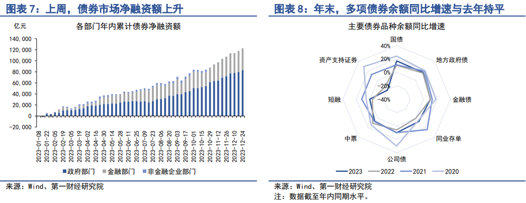从年内来看,新增债券融资主要由政府部门和金融部门主导,两者占今年新增债券净融资的比重分别为68.08%和32.5%。截至12月24日,政府部门债券余额同比增速为16.7%,较2022年同期增速上升3.4个百分点;金融部门债券余额同比增速为9.4%,较2022年同期增速上升2个百分点;非金融企业部门债券余额同比增速为1.8%,较2022年同期增速上升0.3个百分点。