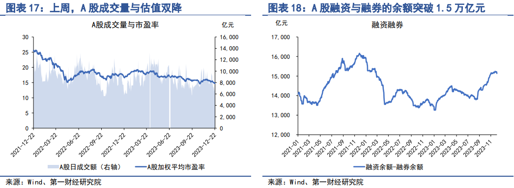 上周,A股成交量与估值双双下降。从成交量来看,上周A股日均成交量下降10.7%至7049亿元,其中12月18日、19日以及20日连续三日单日成交量跌至7000亿元以下。A股加权市盈率下降3%至14.85,创下2013年以来最低值。截至12月22日,A股融资与融券余额的差额达到1.51万亿元,占A股总市值的比重超过2%。