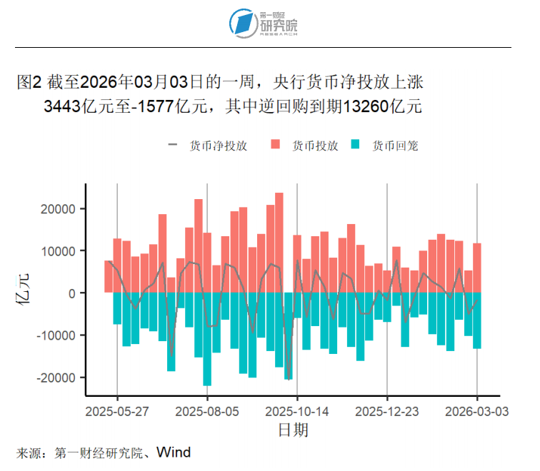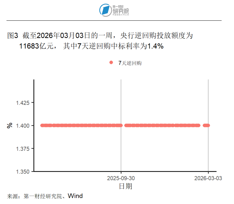 截至3月3日的一周,央行通过公开市场净回笼资金1577亿元。本周,央行逆回购投放额度为11683亿元,逆回购到期13260亿元,7天逆回购中标利率为1.4%。