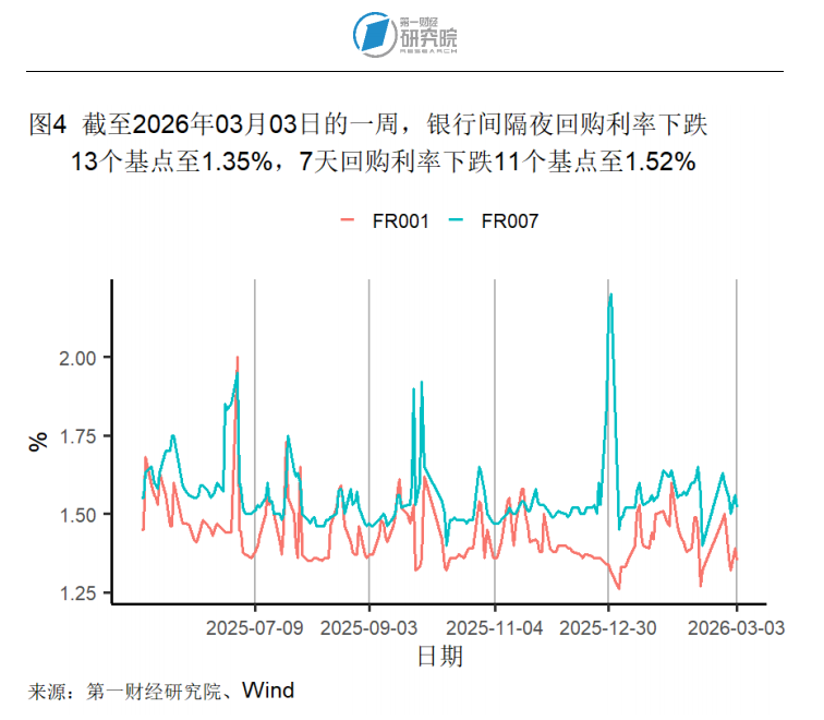 截至3月3日的银行间隔夜利率在过去一周下降13个基点至1.35%,在过去一个月下降8个基点,较去年同期下降52个基点。七天回购利率在过去一周下降11个基点至1.52%,在过去一个月下降4个基点,较去年同期下降43个基点。