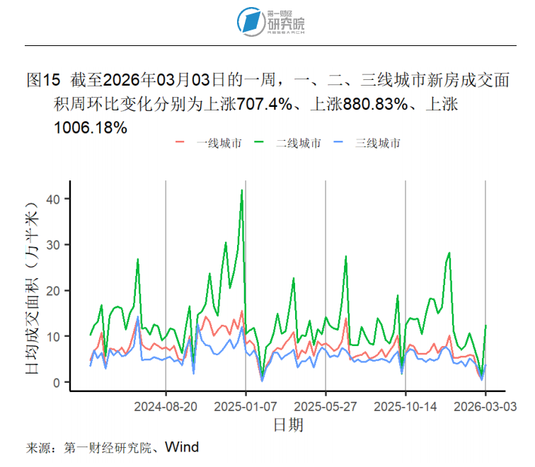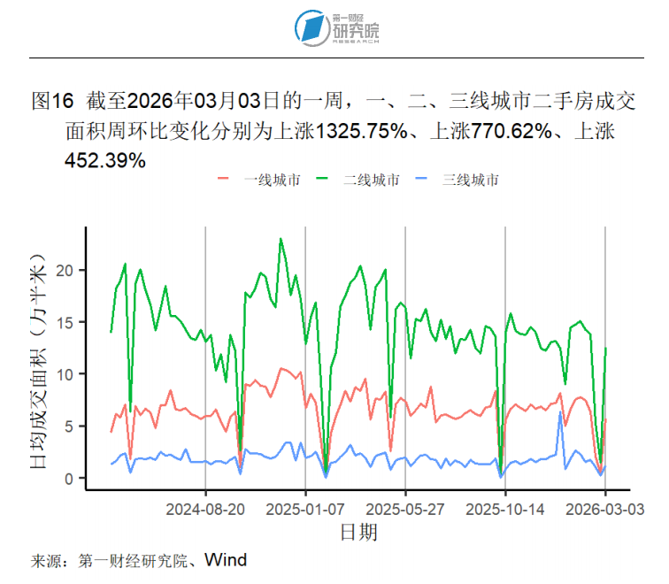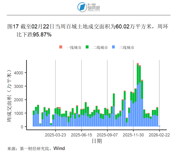 按周来看,截至3月3日的一周,一、二、三线城市新房成交面积分别环比上升707.4%、880.83%和1006.18%。一、二、三线城市二手房成交面积则分别环比上升1325.75%、770.62%和452.39%。本周,所有房屋日均成交面积均低于去年同期水平。截至2月22日的一周,百城土地成交面积为60.02万平方米,周环比下降95.87%。