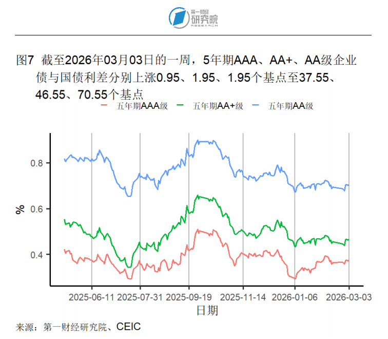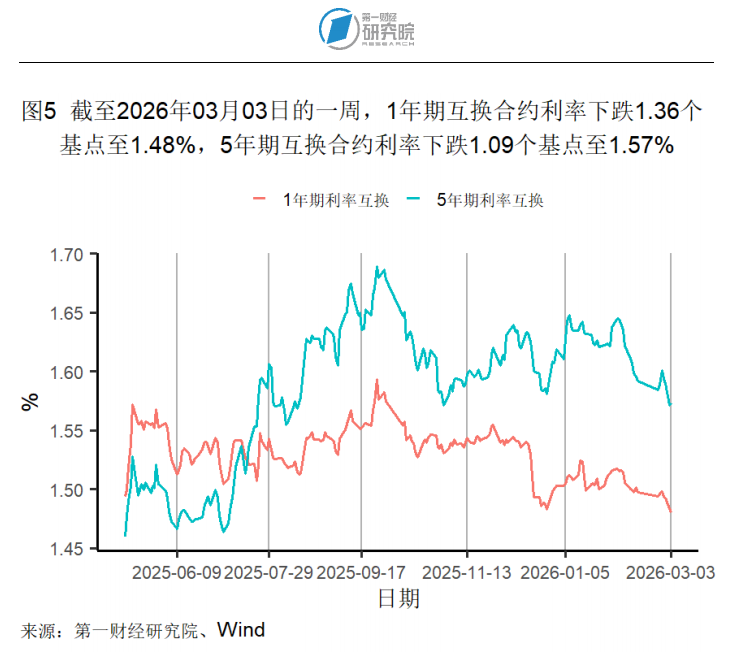 截至3月3日的1年期互换合约利率较一周前下降1个基点至1.48%,在过去一个月下降4个基点,较去年同期下降26个基点。5年期互换合约利率较一周前下降1个基点至1.57%,在过去一个月下降7个基点,较去年同期下降5个基点。