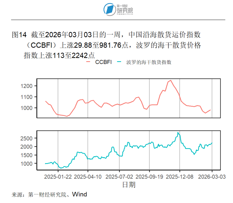 中国沿海散货运价指数(CCBFI)在截至3月3日的一周上升29.88点至981.76点;波罗的海干散货价格指数上升113点至2242点。