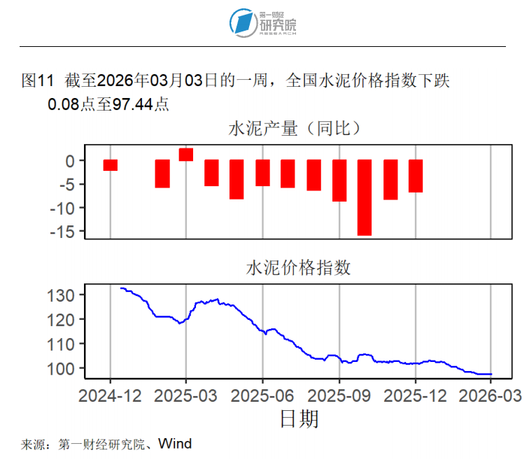截至3月3日的钢坯价格在过去一周上升了1.04%,较一个月前下降0.34%,较去年同期下降5.83%。截至3月3日的水泥价格在过去一周下降0.08%,过去一个月下降1.00%,较去年同期下降18.87%。动力煤价格与一个月前水平一致,较去年同期下降了1.30%。