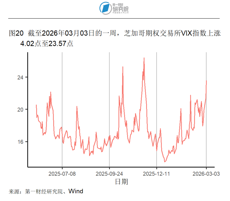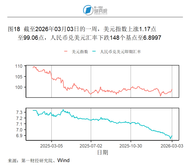 高频数据显示,截至3月3日的一周,美元指数上升1.17点至99.06点;人民币兑美元汇率下降148个基点至6.8997。截至3月3日的一周,芝加哥期权交易所VIX指数上升4.02点至23.57点。