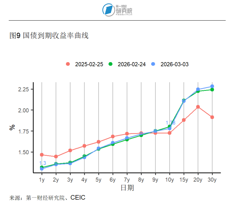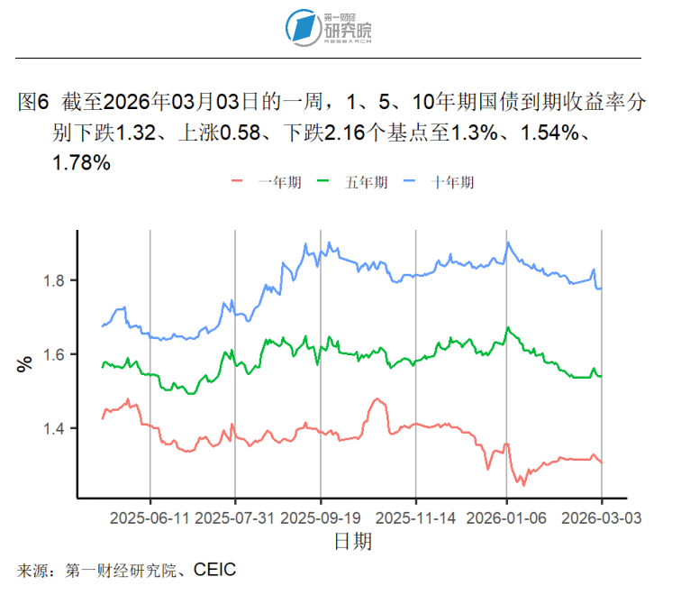 截至3月3日的一周,1年期和10年期国债到期收益率分别下降1.32和2.16个基点至1.3%和1.78%;5年期国债到期收益率上升0.58个基点至1.54%。